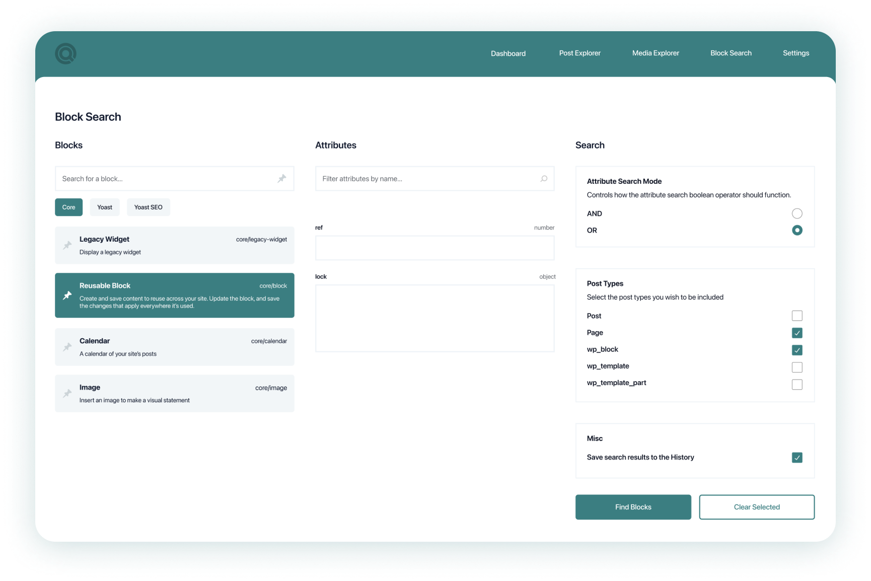 Quickly search and view blocks used across your pages and post types, with extensive filters to allow for more advanced results.